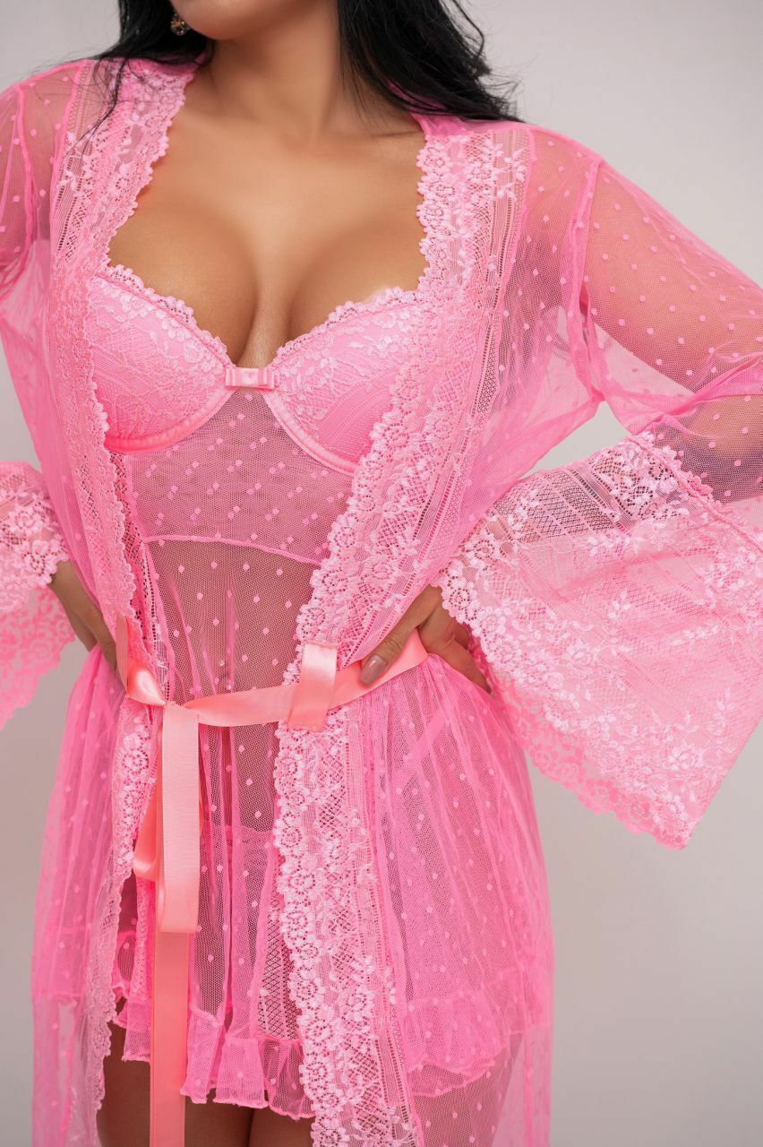 1 Camisola em tule de poá e com renda, sem aro e com bojo, aberta atrás e com regulagem nas alças,calcinha semi fio com regulagem nas laterais.